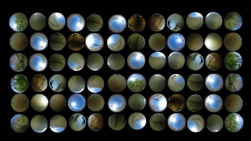The composition has 72 hemispherical videos on a black background. The overall composition blurs the impression of space and depth within the scene. There is no sense of positive and negative space. The overall composition of the video is flat, but the round hemispherical videos protrude from the flatness of the space. The circular shapes are the original shapes of the camera’s eyes. The video challenges the viewer with the distorted and reversed perspective. This work encourages a new way of seeing and broadens how to view their surroundings.