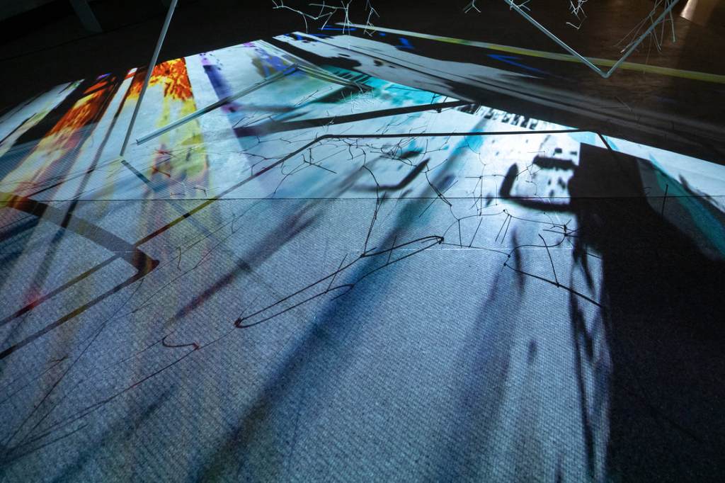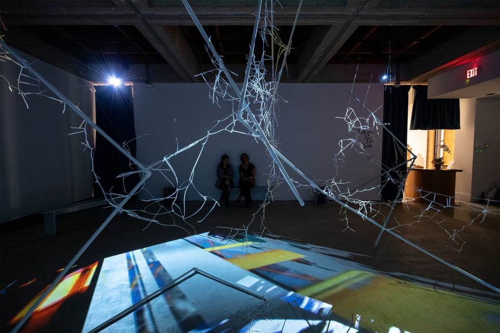 This site-responsive installation combines video, sound, PVC pipes, zip ties, and ropes, arranged to form linear, map-like structures. Two videos are projected from opposite corners of the space, casting shifting shadows that change based on the imagery. Four speakers, placed in a quadraphonic setup, emit both field recordings (e.g., trains, water, footsteps) and modular synthesizer sounds. As viewers move through the space, different audio elements become prominent depending on their proximity to the speakers. When standing at the center, the viewer is surrounded by a dynamic soundscape, while visuals and shadows continuously evolve across the installation.